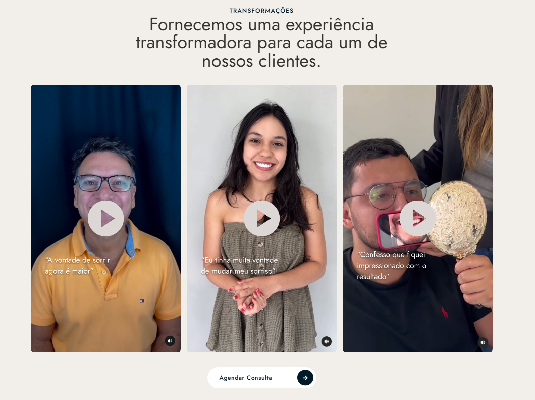 Design visual: imagens fortes de antes/depois, seções com fotos, botões de ação visuais e repetidos (“Agendar Consulta”), layout limpo, uso de áreas de destaque, cores que passam confiança e higiene, tipografia legível.