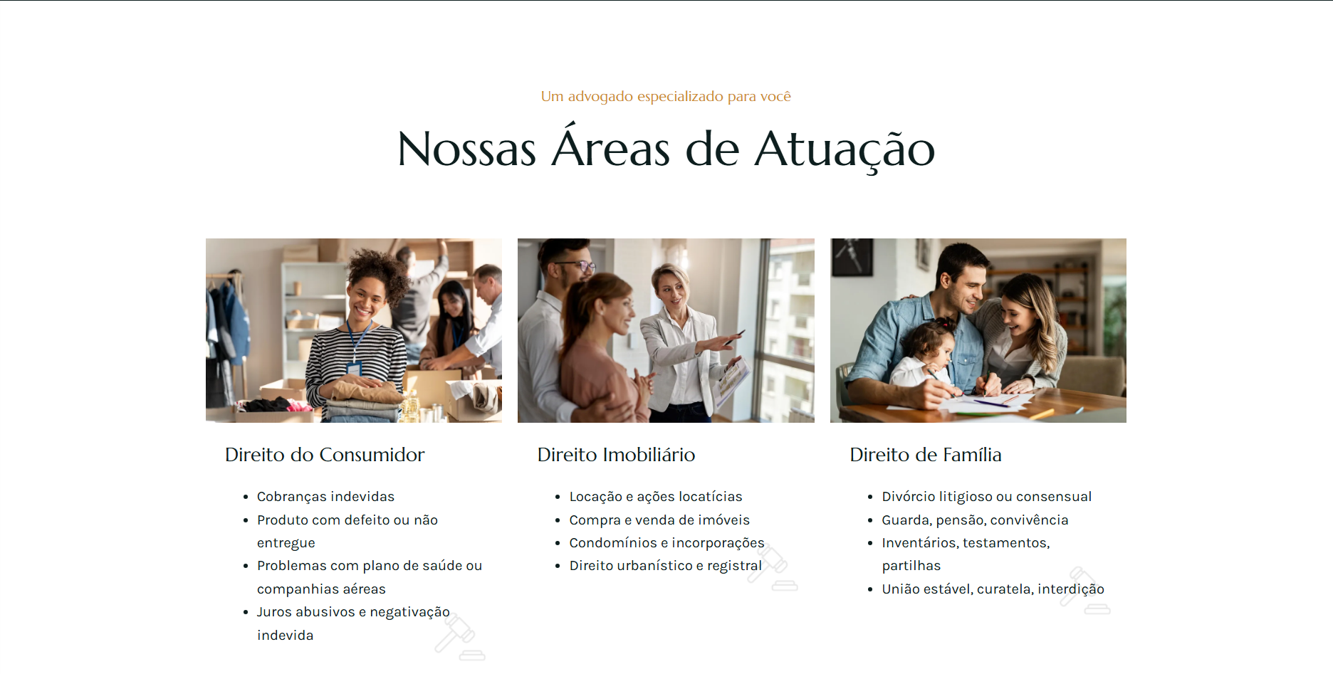 Havia necessidade de mostrar claramente as áreas de atuação especializadas (Consumidor, Família, Imobiliário etc.), com destaque visual e linguagem acessível para clientes que não conhecem termos jurídicos.